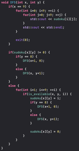 다음은 DFS 함수이다. 나는 맨 처음에 DFS 함수가 다 끝나면 main 함수에서 스도쿠 결과를 출력하도록 시도했는데 잘못된 방법이었다. 가장 최적의 방법은 스도쿠 모든 칸을 다 확인 했을 때 DFS함수 안에서 출력을 하고 프로그램을 종료하는 것이다. 나는 여기서 exit(0)를 썼는데 만약 DFS를 최초로 호출한 스코프로 돌아가야 한다면 return을 적절하게 추가해야 할거 같다. 만약 아직 모든 스도쿠 칸을 확인을 못했다면 현재 칸의 값을 확인해서 0이 아니라면 다음칸으로 넘어가고 현재 칸이 0으로 비어있다면 1부터 9까지 반복문을 돌면서 가능한 숫자를 확인한다. 이때 가능한 숫자를 확인하면 해당 칸의 숫자를 업데이트하고 다음칸으로 넘어가게 된다.